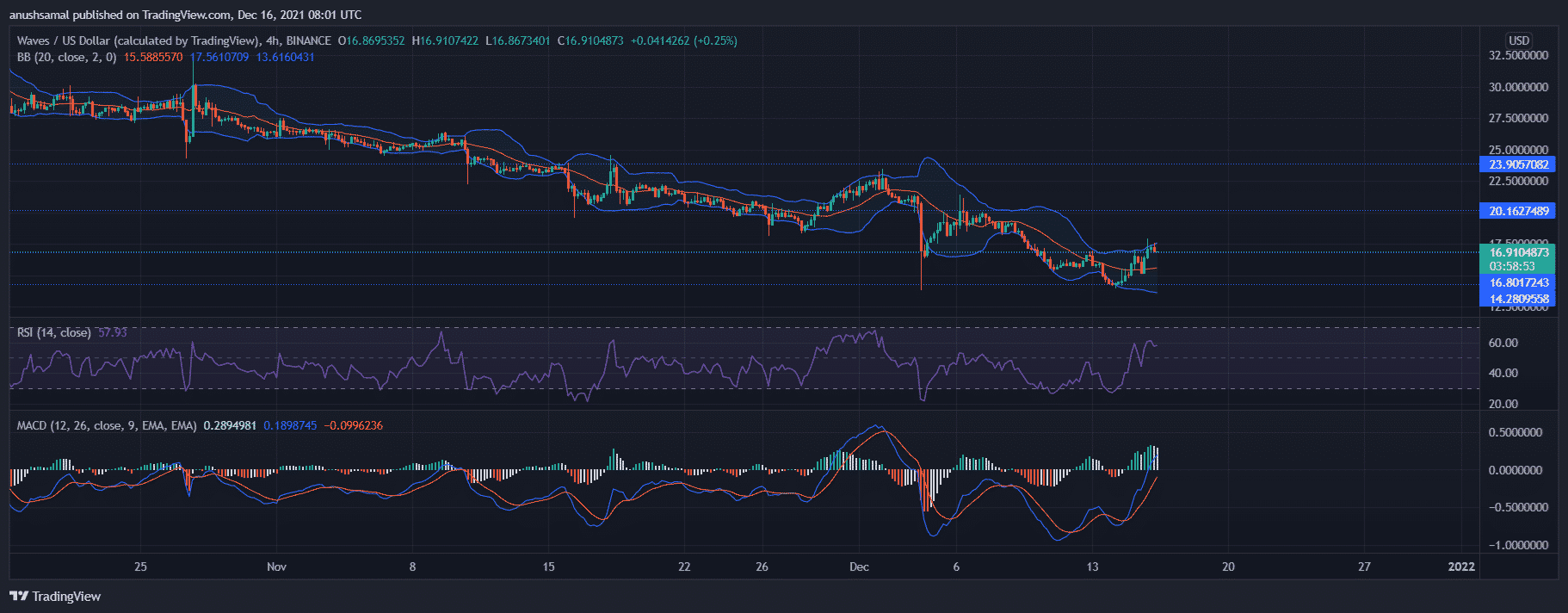 Waves have seen a southbound movement for the past month and a half. Although the digital currency witnessed sporadic upward movements on its chart, it kept encountering significant selling pressure. At the time of writing, however, Waves happened to secure new gains; it went up by 4.4% and was trading for $16.91. With a continued increase in buying strength, the coin could attempt to trade near its price ceiling of $20.16. The robust resistance mark for the coin stood at $23.90.
