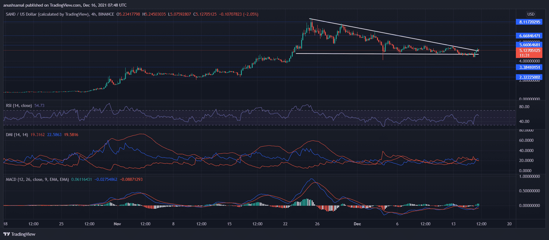 Sand portrayed outstanding rallies since the end of October. Nonetheless, these rallies have also faded out quickly. Recently, prices of Sand had formed a descending triangle, which meant that the coin represented a bearish market downtrend. Over the last 24 hours, the coin invalidated the possible downward breakout and gained 7.7%, breaking above its descending triangle. At press time, Sand was priced at $5.12 with an immediate resistance at $5.66.