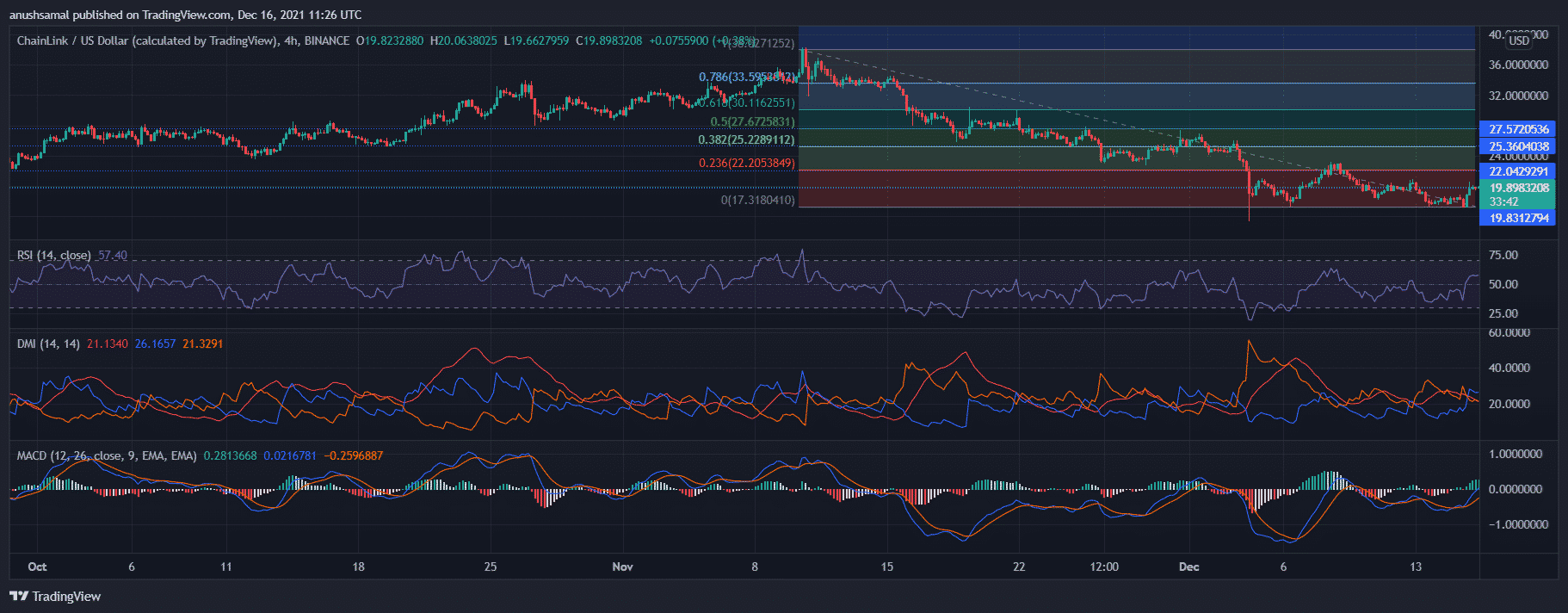 Chainlink’s price stood at $19.89 after an upswing that brought double-digit gains for the coin. The token’s solid resistance mark was at the 23.6% Fibonacci level. This break from Chainlink downward price action is reflected in its technical indicators. The rise in prices could push LINK to trade above its price resistance of $22.04, even though the bulls had attempted to test the abovementioned levels multiple times only to face rejection right after.