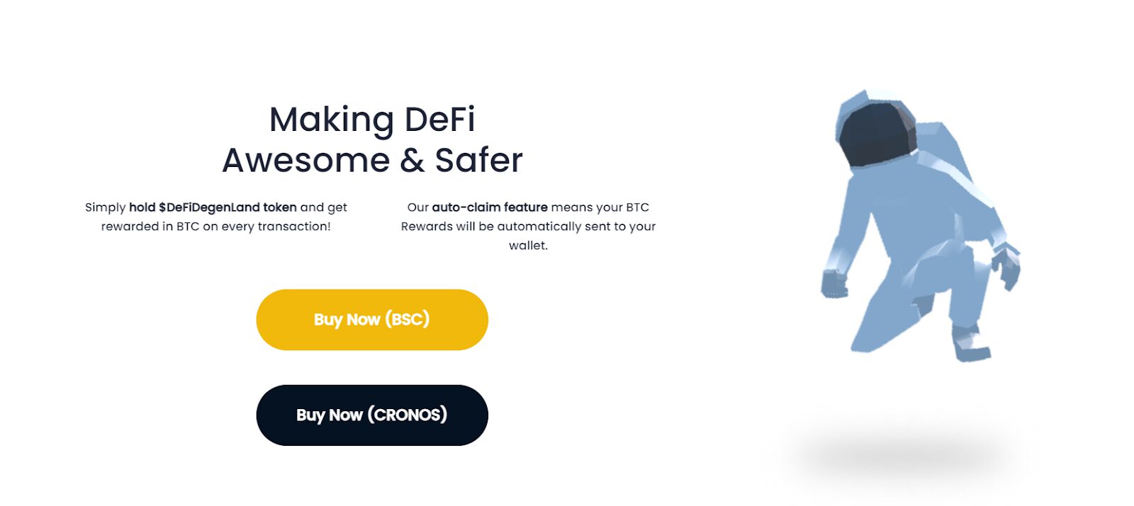 - 8% Redistribution In BTC: 8% of every buy/sell is taken and redistributed to all holders. Hold $DeFiDegenLand tokens, earn BTC. A Minimum of 900 tokens is required in order to receive rewards.