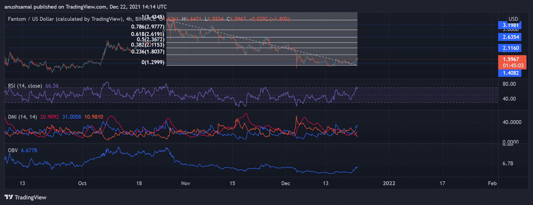 Fantom was trading at $1.59 after a major pullback in prices, which the coin had encountered at the 78.6% Fibonacci level. Fantom’s prices shot up by over 13% in the past day. The coin’s technical outlook highlighted an extreme bullish pressure.