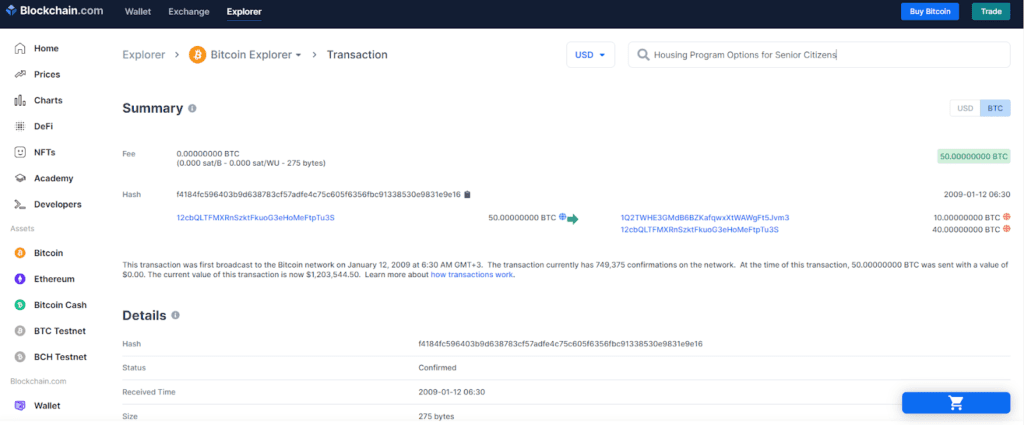 Once you find the Transaction ID for the transaction you want to view, head to blockchain.com paste in the Transaction ID and click search. Select the result that appear and you will see all the transaction details. In the above screenshot you can view the very first bitcoin transaction by Sitoshi.