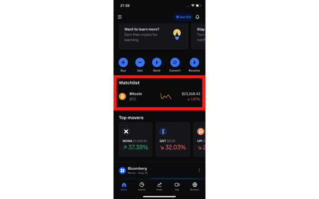 - Scroll down your dashboard to find the Watchlist section. Under this section, select the crypto whose transactions you want to view.