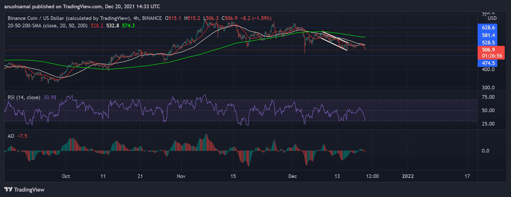 Binance Coin was seen trading below the 20-SMA line, which signaled that sellers had driven the price momentum in the market. At press time, the coin was valued at $506.9 after it noted a pullback at $581.4 and then at $528.5, respectively.