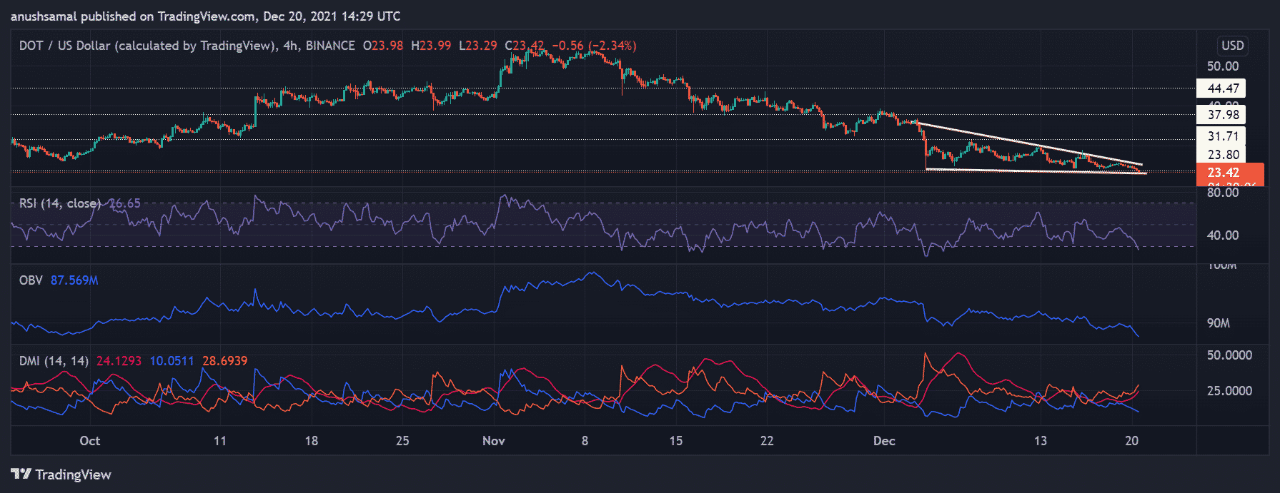 Polkadot’s market price has declined from November, and the coin had managed to stay put above the long-standing support mark of $23. At press time, the coin price was $23.42, falling beneath which it would invalidate its four-month long price floor and trade near $19.