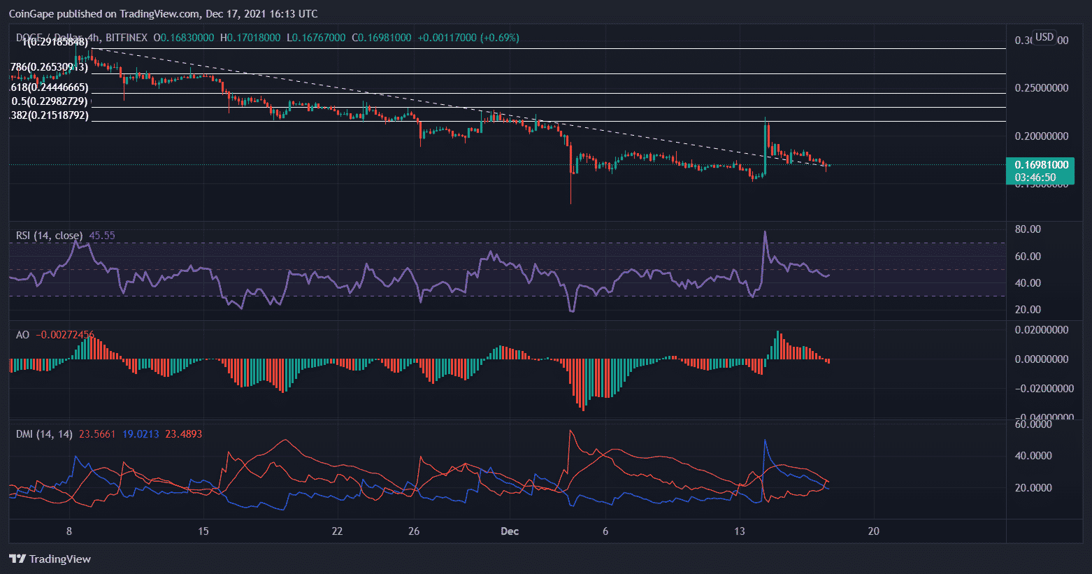 Dogecoin’s solid pullback from the 38.2% Fibonacci level. The coin encountered a17% decline ever since Doge’s short-lived rally. At press time the coin was priced at $0.169. The immediate support level for the coin stood at $0.215, as evidently seen by the number of times bulls were rejected from the level. In case of a further breakdown in Doge’s prices, the local price floor awaited the coin at $0.160.
