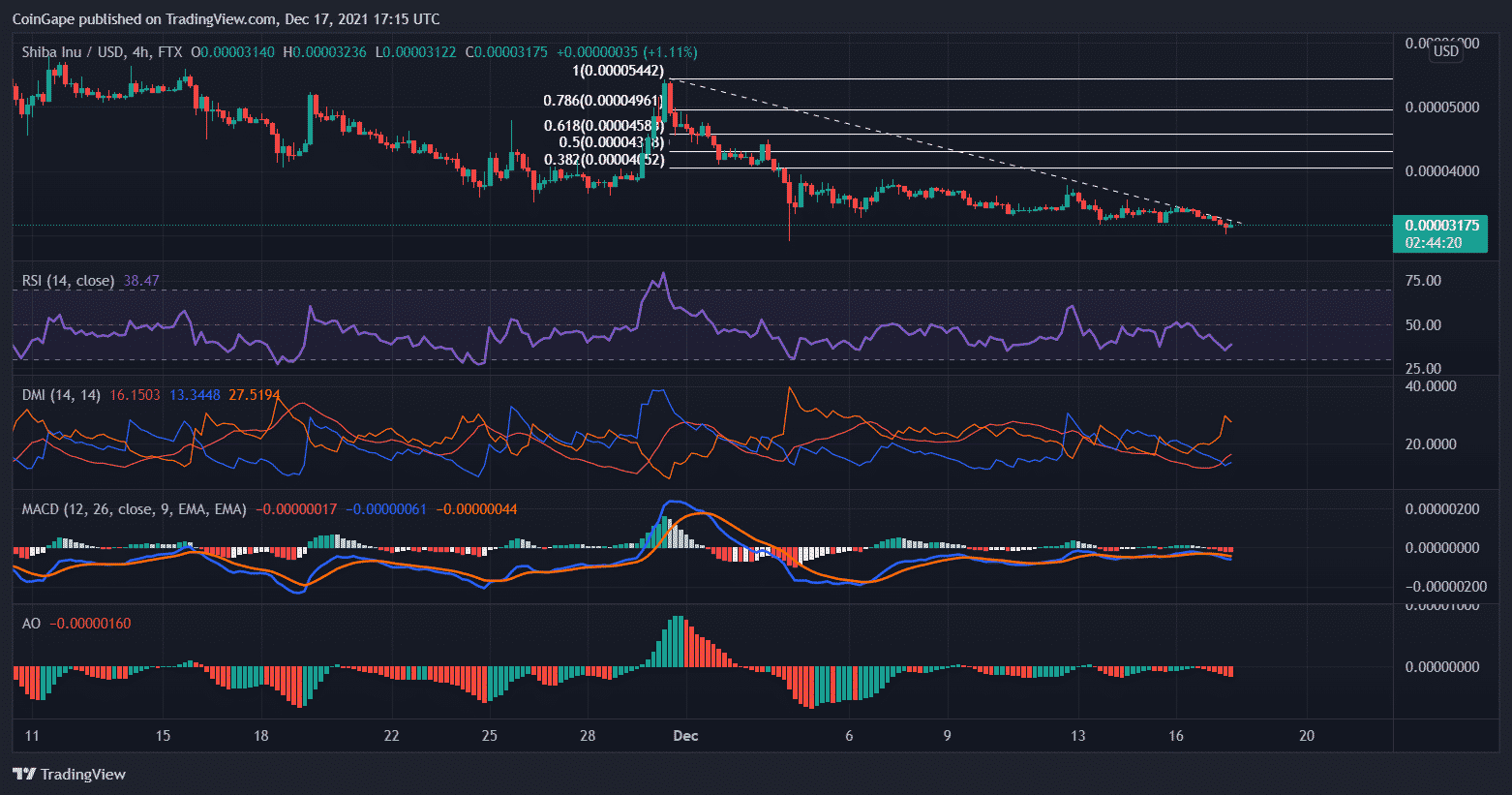 Shiba Inu’s price action slackened since the beginning of December, and the coin was consolidated over the last few weeks. The vital support level for the coin stood at $0.000030, while the immediate resistance was at $0.000040. Going by the broader market trend, the coin has formed a descending triangle which might extend to a further bearish price movement. A further descend in prices might cause the coin to invalidate its multiple long support line and trade at $0.000024.