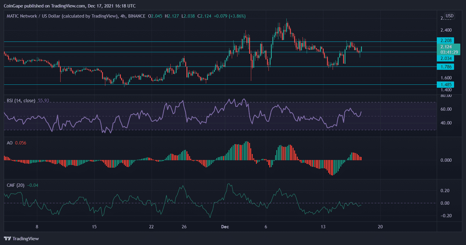 Despite a fall in prices, the Relative Strength Index rose above the midline, which pointed towards chances of MATIC reversing its price action. Although Chaikin Money Flow remained in the negative territory as capital inflows didn’t revive themselves over the last trading sessions. Although the red histograms were declining, the awesome Oscillator projected bearish price action to signal a possible price reversal.