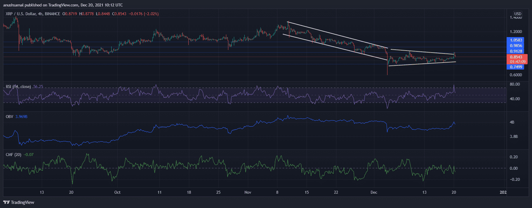 The fear index suggested that the market was still quite apprehensive about investments. Despite that, XRP moved up its chart by 3.3%. At press time, the coin was trading at $o.85. The altcoin’s downward channel was met by an ascending triangle that was formed over the last couple of weeks. In the last week also, XRP was mainly consolidating with brief recovery periods thrown in between. The trading range remained between $0.91 and $0.74.