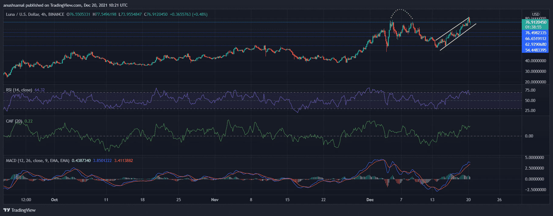 Exchanging hands at $76.91, the next target for LUNA’s prices was $80. A fall below the current price level meant that Terra would be priced at $76.49 and then $66.65.