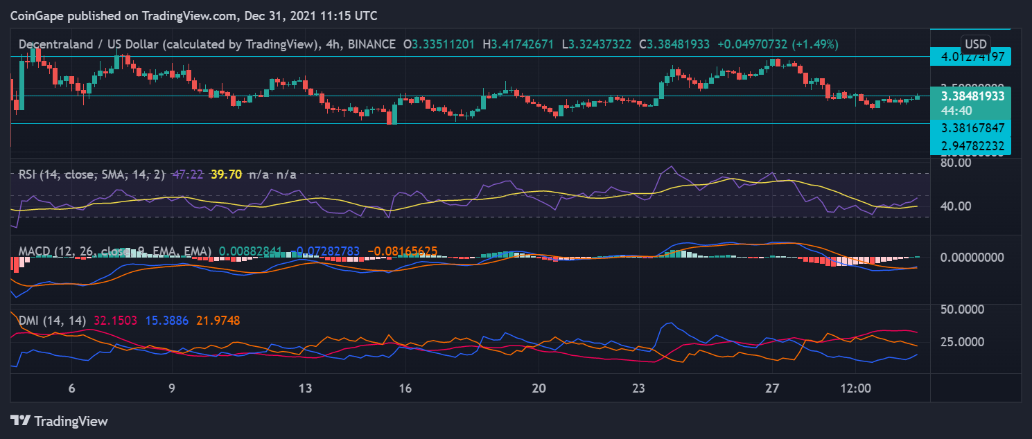 Decentraland was trading at $3.38 after it rose by 3.8% over the last 24 hours. Overhead resistance for the coin stood at $4.01, and the support line was at $2.94. Near term, technicals indicated bullishness. If the coin maintained a bullish stance, MANA could target a 17% growth in future trading sessions.