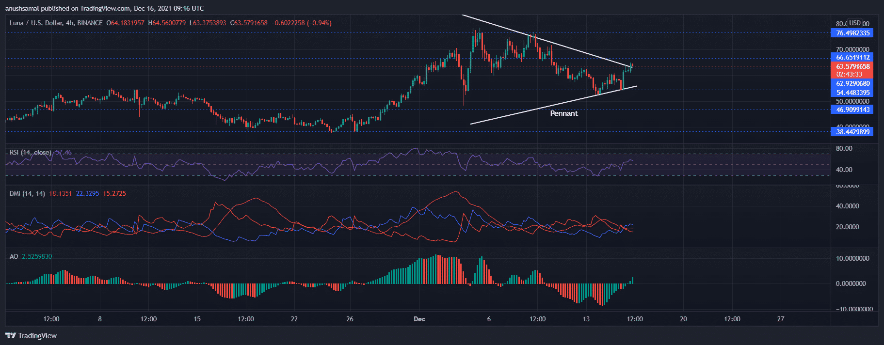 Terra had registered its ATH on December 5, ever since which the coin infrequently has moved up and down the charts. The coin had formed a symmetrical triangle, following which Terra broke to the upside. The coin was priced at $63.57 after bagging double-digit gains over the past 24 hours. Terra had broken above its resistance mark of $62.92, and with a continued push from the bulls, it could attempt to retest $66.65 and subsequently the $76.49 price level.