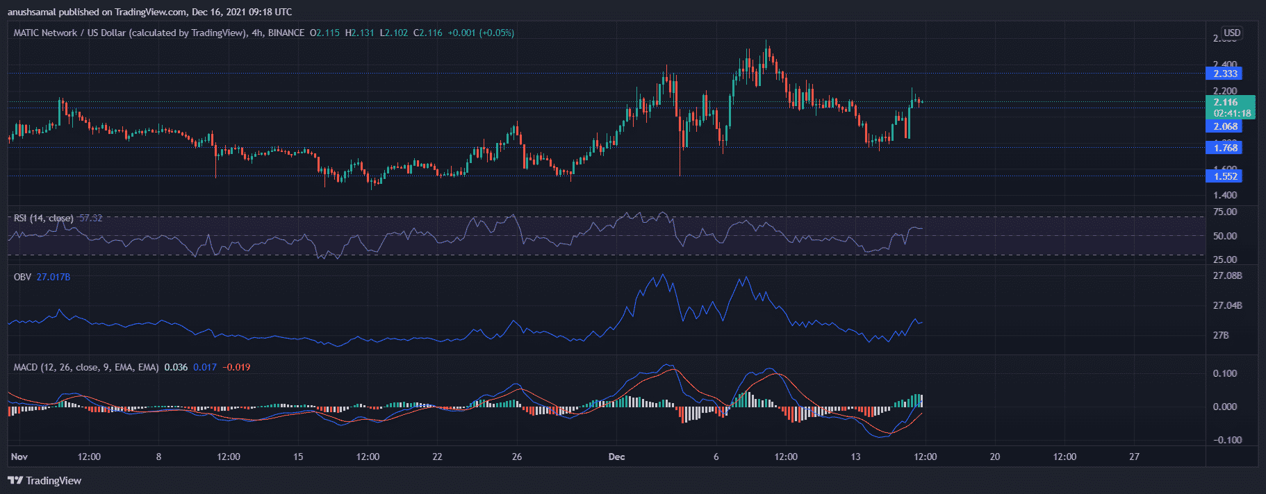 Matic was trading for $2.11 after it toppled over its price ceiling of $2.06. The coin displayed signs of steady appreciation. With continued northbound movement, Matic could trade near the $2.33 price mark. The digital currency had increased ROI ever since the end of November and could retest its ATH. Matic’s technical indicators highlighted short-term bullish price action, as the coin slowly was on the rise to retest its long-standing resistance mark of $2.22.