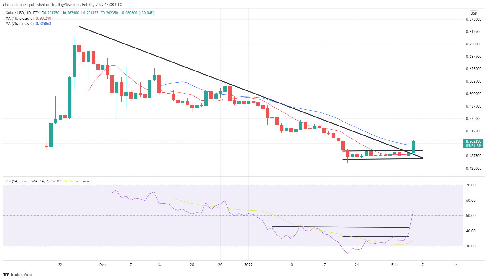 Today’s move has come just as the price of GALA broke out of its 2-week resistance level of $0.2115, which has been held since January 21.
