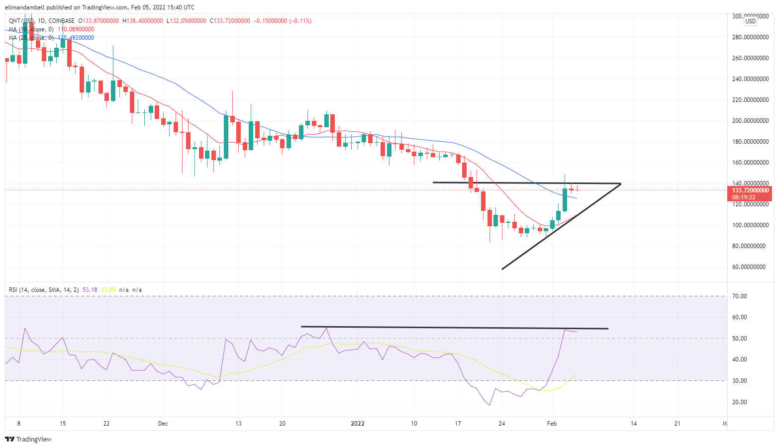 Following four consecutive sessions of rallies to start the week, QNT/USD was down by almost 5% as of writing, hitting an intraday low of $130.77 in the process.