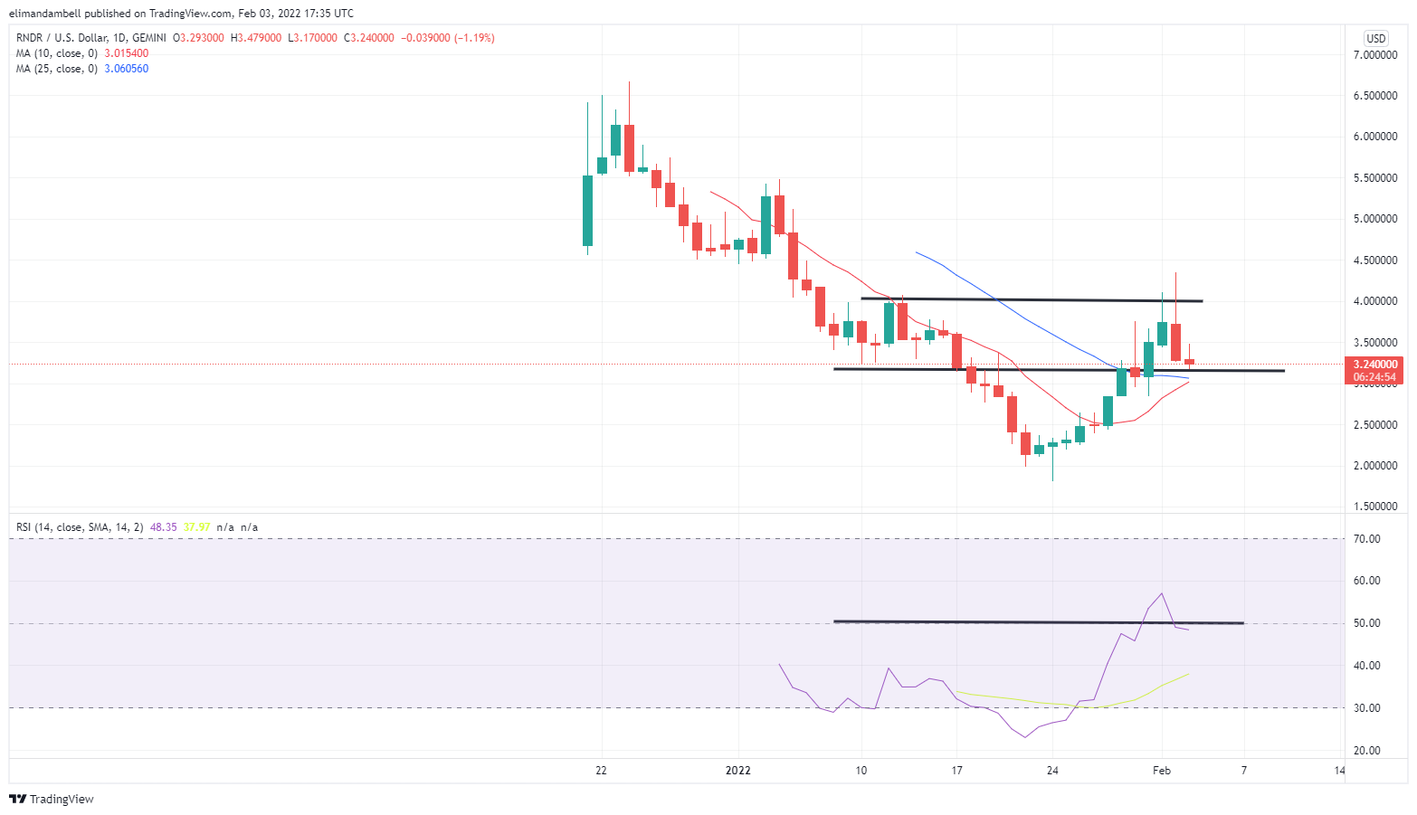 Following a recent streak of rallies, RNDR/USD finally paused for breath, with prices selling off close to resistance of $3.96.
